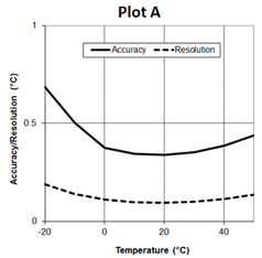 精度:± 0.44 °C從0 °到50°C ( ± 0.79 °F從32 °到122°F ) ,見下圖plotA