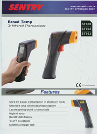 紅外測溫儀ST660是非接觸紅外溫度測量儀。測量范圍廣闊( -50 -999 °C ),使用戶遠離危險區域。測量時直接指向被測物體,扣動扳機并保持可顯示讀數。須確保目標區域大于儀表物距比要求的尺寸。