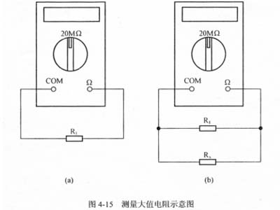 預先準備一只十幾兆歐的電阻R1,將數字萬用表撥至20MΩ檔后測出電阻值R1,如圖4-15(a)所示。然后把被測電阻Rx并聯在R1兩端,再測出并聯總電阻R,如圖4-15(b)所示。