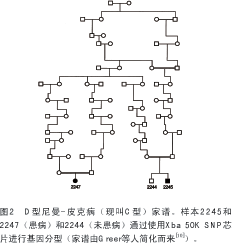 為了比較高通量SNP芯片和微衛星標記對家族性遺傳圖譜的有效性,作者利用大量不帶D型隱性尼曼-皮克病的新斯科舍阿卡迪亞家族成員驗證一個已知的遺傳連鎖[9,10]。通過原位克隆鑒定得知潛在的致病基因是NPC1(OMIM#257220)[11],從而在新斯科舍家族患病個體中證實了NCPI存在著純合子突變[12]。作者又利用Xba 50K芯片(Affymetrix公司,圣克拉拉,加拿大)對兩位患病的遠房親屬和一位該家族未患病親屬進行基因分型(見圖2)。如表1所示,兩位患者 18號染色體上相同的等位基因中,具有共享純合性的SNPs的最大拉伸長度約為7.7M堿基對,其中包括圍繞NPC1的位于19.4M堿基對處的71個連續的SNPs。未患病親屬樣本2244中有30個標記與患病者不一致,某些是雜合子而另一些是其他SNP等位基因的純合子(該數據未顯示)。由此可見 SNP芯片可以省時、省力、省錢地成功復制整個家族樣品的連鎖圖譜。