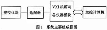 由圖1可見,它由四大部分組成,分別是:①VXI機箱及各儀器模塊,主要作為校準(zhǔn)時的標(biāo)準(zhǔn)儀器,包括函數(shù)信號和RF信號發(fā)生器、通用計數(shù)器、數(shù)字多用表、示波器、接收機以及射頻開關(guān)模塊:②主控計算機,用于系統(tǒng)協(xié)調(diào)控制與數(shù)據(jù)處理:③適配器,用于實現(xiàn)被校儀器與該系統(tǒng)的連接、阻抗匹配變換、信號衰減等功能,同時提供穩(wěn)定可靠、頻率和電壓分段可調(diào)的1mV~300V交、直流電壓。④被校的各種儀器。本校準(zhǔn)系統(tǒng)具體可對六大類儀器的58項參數(shù)進(jìn)行校準(zhǔn),其中對頻率計類儀器校準(zhǔn)的參數(shù)分別是:測頻率、周期、比率、靈敏度、時間間隔以及頻率穩(wěn)定度。